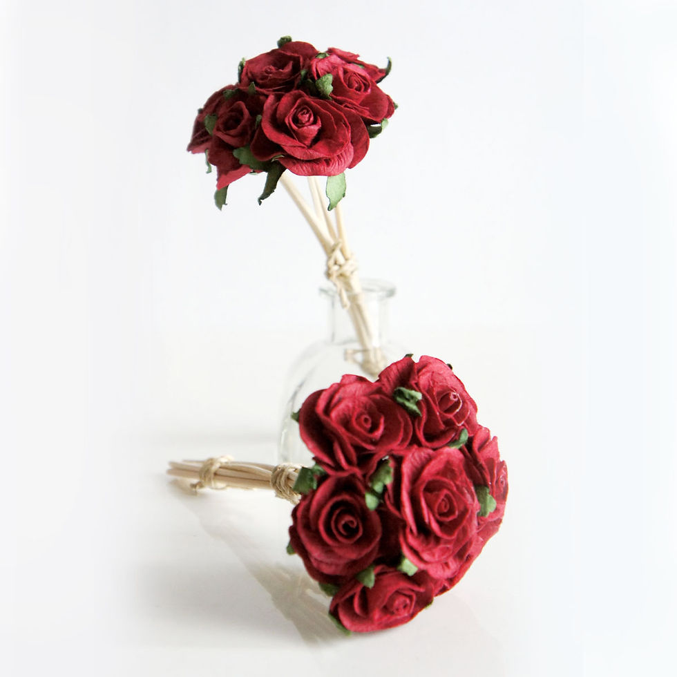 Mulberry paper flowers are made from the fibers of the mulberry tree and have properties such as durability, flexibility, and the ability to be made into large sheets. They are more versatile in usage than sola flowers, which differ in texture. Mulberry paper flowers can be better controlled when dyeing and can absorb aroma oil similar to sola flowers. However, the production process of mulberry paper flowers involves the use of chemicals, so they are not 100% natural materials