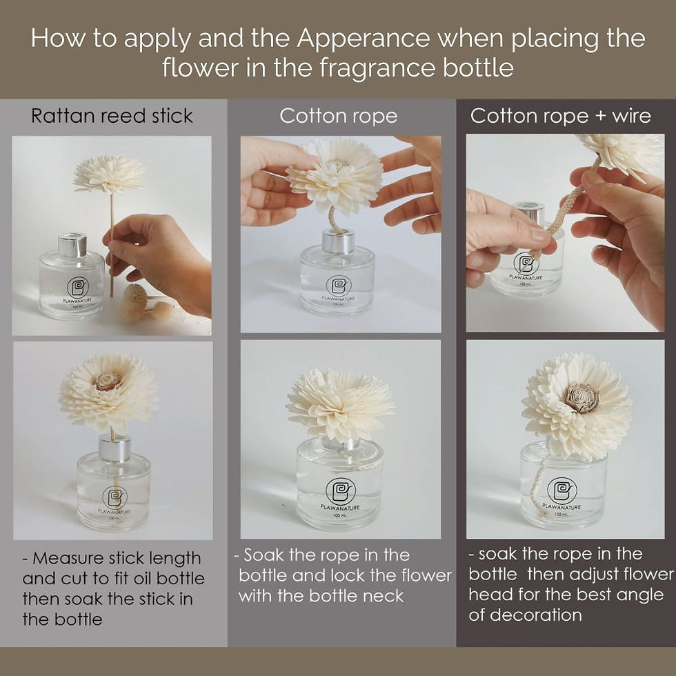 Example from Thailand: A notable example is "Chompoo Thip" grass, which is characterized by small decorative flowers along its branches. This unique material weaves a delicate, airy texture into the arrangement while also serving as a functional wick.